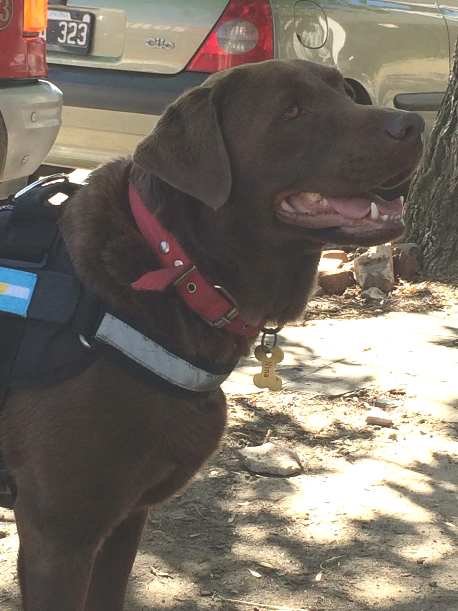 En el día del Animal les queremos presentar a Nina. Ella tiene 5 años y es una perra raza Labrador Retriever y forma parte del cuerpo activo de Bomberos Voluntarios de Alte. Brown, con el legajo canino K9 LP. Nº 01y desde los seis meses de edad fue entrenada en la búsqueda de personas con vida y también cadáveres, en tierra y agua.