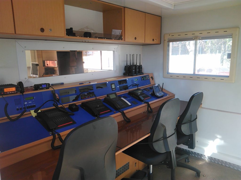 La unidad cuenta con 2 sectores bien diferenciados, una sala destinada a las comunicaciones y control de la propia unidad para 3 operadores, y una sala destinada a la coordinación de operaciones para 6 operadores. Toda la unidad se encuentra acondicionada para soportar las inclemencias climáticas adversas (tanto en frio como en calor), está dotada de sistemas de calefacción y refrigeración, brindando comodidad al personal que debe toma decisión sobre la emergencia.